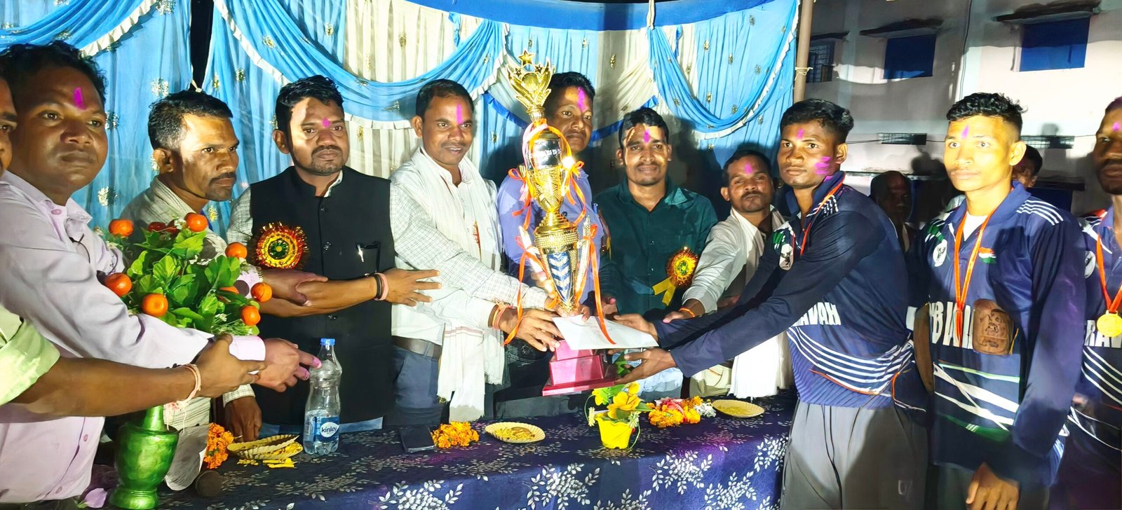 हरवेल/फरसगांव ~ कोंडागांव जिले के विकासखंड बड़ेराजपुर अंतर्गत आदर्श ग्राम पंचायत हरवेल स्थित लाल बहादुर शास्त्री स्टेडियम में नवरात्रि के शुभ अवसर पर 25 सितम्बर से पंद्रह दिवसीय मैच का पंचायत स्तरीय क्रिकेट प्रतियोगिता का आयोजन किया गया था जिसका फाइनल मुकाबला 8 अक्टूबर बुधवार को खेला गया जिसमें कुल 65 टीमों ने भाग लिया खास बात यह रही कि लगातार बारिश के चलते समितियों के द्वारा पंद्रह दिवसीय क्रिकेट प्रतियोगिता का आयोजन किया गया था| समापन समारोह में जिला पंचायत उपाध्यक्ष हीरासिंह नेताम बतौर मुख्य अतिथि के रूप में शिरकत करने पहुंचे सर्वप्रथम हीरासिंह नेताम के द्वारा टास उछाल कर समापन समारोह के फाइनल मैच का शुभारंभ किया तत्पश्चात सभी खिलाड़ियों से परिचय प्राप्त करने के बाद आयोजन क्रिकेट समिति को धन्यवाद दिया गया हीरासिंह नेताम ने अपने उद्बोधन में कहा कि चाहे कोई भी खेल हो उसे खेल भावना से ही खेलना चाहिए। खेल में हार जीत दोनों होगा। एक टीम जीतती है तो दुसरी टीम हारती है। कोई भी टीम व खिलाड़ियों को हार से मायुस नहीं होना चाहिए। जिसमें फाइनल मुकाबला केरावाही और बनजुगानी के मध्य खिताबी मुकाबला खेला गया जिससे केरावाही ने टास जीतकर पहले क्षेत्ररक्षण करते हुए बनजुगानी टीम को निर्धारित 6 ओवरों में 55 रनों पर रोका जिसमें केरावाही की टीम ने 56 रनों का लक्ष्य का पीछा करते हुए विजयी चौके से फाइनल मैच में खिताब अपने नाम किया प्रथम पुरस्कार विजेता टीम केरावाही को जनपद पंचायत बड़ेराजपुर अध्यक्ष सुकमन नेताम की और से 20051 रु साथ में चमचमाती ट्राफी दिया गया| उप विजेता टीम बनजुगानी को 10051 रु हरवेल सरपंच महेश नेताम के द्वारा चमचमाती ट्राफी प्रदान किया गया| इस कार्यक्रम को सफल बनाने में मुख्यअतिथि हीरासिंह नेताम जिला पंचायत उपाध्यक्ष कोंडागांव, मिडिया प्रभारी छगेनद्र सिंहा, विशिष्ट अतिथि जनपद पंचायत बड़ेराजपुर अध्यक्ष सुकमन नेताम, उपाध्यक्ष नारायण नेताम, अध्यक्षता महेश नेताम सरपंच हरवेल, विशिष्ट अतिथि जनपद सदस्य प्रतिनिधि दिनेश मरकाम, सरपंच बालेंगा सुकमन मरकाम, उपसरपंच प्रतिनिधि घड़वाराम मंडावी, पनकुराम मरकाम, बलराम मंडावी, अघनसिंह मंडावी, मुकेश कुमार नेताम, धनसाय मंडावी, संतोष मंडावी, पंच्छु राम मंडावी, विजय पांडे, गायता मंगतर मंडावी, पटेल लक्षमीनाथ मंडावी, गोविंद मंडावी हरिलाल मंडावी, फुलसिंह मरकाम, जयसिंह मंडावी , क्रिकेट समिति के अध्यक्ष सहादेव शोरी, उपाध्यक्ष सुखदास मंडावी, सचिव मनोज मंडावी, कोषाध्यक्ष लखमा नेताम, सह सचिव मनीष नेताम , दिनेश मंडावी, सम्पत यादव, मानसाय मंडावी पवन मरकाम, पप्पू मरकाम गोलू यादव, सनत मरकाम , सुरेंद्र मंडावी, केशव मंडावी, मानसाय मंडावी और मंच संचालन 