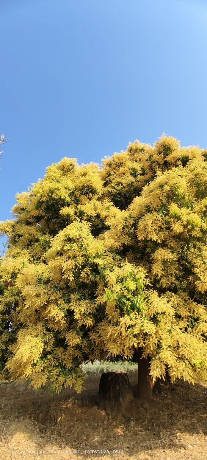 बड़ेराजपुर ~ कोंडागांव जिले के विकासखण्ड बड़ेराजपुर अंतर्गत सभी ग्रामीण क्षेत्रों में इन दिनों फलो के राजा आम के पेड़ों पर बौर (फूल) जगह जगह पर खिलते हुए देखा जा सकता है इसी तरह हरवेल, बालेंगा, पातरीपारा, पीढ़ापाल, कुल्दाडिही, तराईबेड़ा, किबड़ा, पिटिसपाल, गम्हरी तितरवंड, बड़बत्तर, डिहीपारा, राहटीपारा, केरागांव, धामनपुरी में भी ऐसा ही खुबसूरत नजारा देखने को मिल सकता है हरवेल निवासी सहादेव नेताम ने फोटो शेयर करते हुए बताया कि इन दिनों जैसे ही बसंत का मौसम शुरू हो गया आम के पेड़ों पर फूल खिलते हुए देखा जा रहा है इस बार अच्छी तरह से आम लगने की आशा है और जगह जगह पर पलाश के फूलों भी देखने को मिल सकता है अंचल में इन दिनों आम के पेड़ों पर बौर (फूल) खिलने से घर-आंगन और बगीचों में बेहद खूबसूरत नजारा देखने को मिल रहा है। इसे फलो का राजा आम भी कहते हैं पीले-सुनहरे रंग के फूलों से लदे आम के पेड़ न सिर्फ वातावरण को महक रहे हैं, बल्कि किसानों और बागवानों के लिए अच्छी पैदावार की उम्मीद भी जगा रहे हैं।ग्रामीण क्षेत्रों में कई घरों के आंगन और खेत-खलिहानों में लगे आम के पेड़ों पर भरपूर बौर आने से इस वर्ष अच्छी फसल की संभावना जताई जा रही है। मौसम अनुकूल रहने पर बौर से फल बनने की प्रक्रिया मजबूत होगी, जिससे आने वाले महीनों में आम की पैदावार बेहतर रह सकती है।किसानों का कहना है कि यदि समय पर हल्की बारिश और तापमान संतुलित रहा तो आम की गुणवत्ता अच्छी रहेगी और बाजार में दाम भी बेहतर मिल सकते हैं। इससे स्थानीय किसानों को सीधा आर्थिक लाभ मिलने की उम्मीद है।