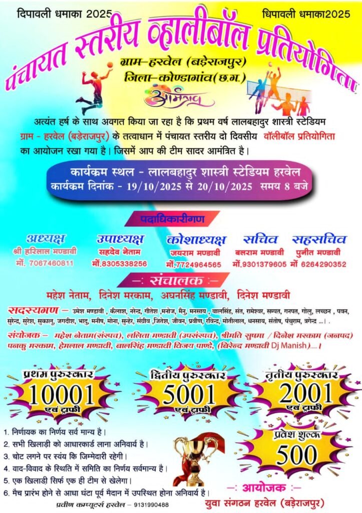 हरवेल/फरसगांव ~ कोंडागांव जिले के विकासखण्ड बड़ेराजपुर अंतर्गत ग्राम पंचायत हरवेल स्थित लाल बहादुर शास्त्री स्टेडियम प्रांगण में दीपावली के पावन अवसर पर पंचायत स्तरीय वालीबॉल प्रतियोगिता का आयोजन प्रथम वर्ष 19 अक्टूबर से 20 अक्टूबर तक दो दिवसीय प्रतियोगिता का आयोजन युवा संगठन के द्वारा किया गया है