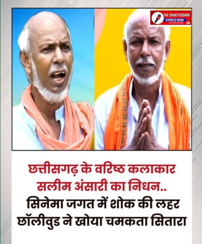 रायपुर: छत्तीसगढ़ के वरिष्ठ कलाकार सलीम अंसारी का निधन हो गया है। उनके निधन से कला और सिनेमा जगत में शोक की लहर दौड़ गई है। सलीम अंसारी ने छत्तीसगढ़ सिनेमा में अपनी अदाकारी और कलाकारी से खास पहचान बनाई। सलीम अंसारी ने अपने लंबे और समर्पित अभिनय करियर में सैकड़ों छत्तीसगढ़ी फिल्मों में काम किया। उनके निधन से फिल्म और कला जगत में शोक की लहर है।सलीम अंसारी ने अपने करियर की शुरुआत थिएटर से की और बाद में एल्बम और फिल्मों में अपनी अदाकारी से दर्शकों का दिल जीत लिया। उन्होंने निर्देशक सतीश जैन निर्देशित फिल्म झन भुलव मां बाप ला में अभिनय किया जिसके बाद उनकी हर फिल्म चाहे वह छत्तीसगढ़ी हो या भोजपुरी दर्शकों द्वारा सराही गई। उनकी सहज अभिनय शैली हास्य से भरे संवाद और विनम्र व्यक्तित्व ने उन्हें हर उम्र के दर्शकों के बीच बेहद लोकप्रिय बना दिया।छत्तीसगढ़ी सिनेमा जगत के दिग्गज कलाकार और अभिनेता सलीम अंसारी के निधन की खबर से पूरे छॉलीवुड इंडस्ट्री में शोक की लहर फैल गई है। सलीम अंसारी ने अपने अभिनय से छत्तीसगढ़ी फिल्मों में एक खास पहचान बनाई थी और कई यादगार किरदारों से दर्शकों के दिलों में जगह बनाई।उनके निधन की जानकारी सामने आते ही सोशल मीडिया पर कलाकारों और प्रशंसकों ने गहरा शोक व्यक्त किया है। कई कलाकारों ने उन्हें छॉलीवुड की आत्मा और एक प्रेरणादायक कलाकार बताया है।फिल्म इंडस्ट्री से जुड़े लोगों का कहना है कि सलीम अंसारी का जाना छत्तीसगढ़ी सिनेमा के लिए एक अपूर्णीय क्षति है। उनके योगदान को हमेशा याद किया जाएगा।