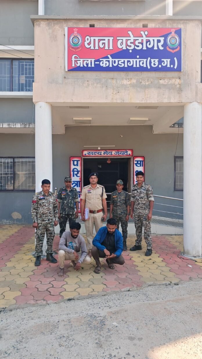 दोनों साकिनांन बड़ेडोंगर देवद्वार कालोनीं थाना बड़ेडोंगर जिला कोण्डागांव छ०ग०।को पकड़ कर आरोपीयों के कब्जे से फावड़ा व लकड़ी का डण्डा को जप्त किया गया। आरोपीयों को गिरफ्तार कर न्यायिक रिमाण्ड पर भेजा गया है।