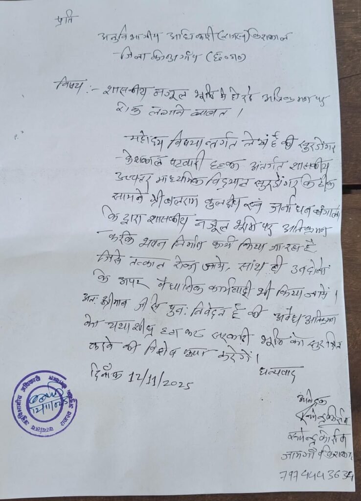 अवैध मकान निर्माण कार्य को रोकने के लिए मूक पत्रिका अखबार के विशेष संवाददाता छत्तीसगढ़ द्वारा केशकाल एस डी एम को दिया गया है लिखित आवेदन पत्र, किन्तु दुर्भाग्य देखिए अब तक किसी भी तरह से कोई वैधानिक कार्यवाही नहीं किया गया है । जवाबदार अधिकारी के द्वारा किसी प्रकार से कानूनी कार्यवाही नहीं करने से अतिक्रमण करने वाले लोगों का मनोबल बढ़ता रहा है ।