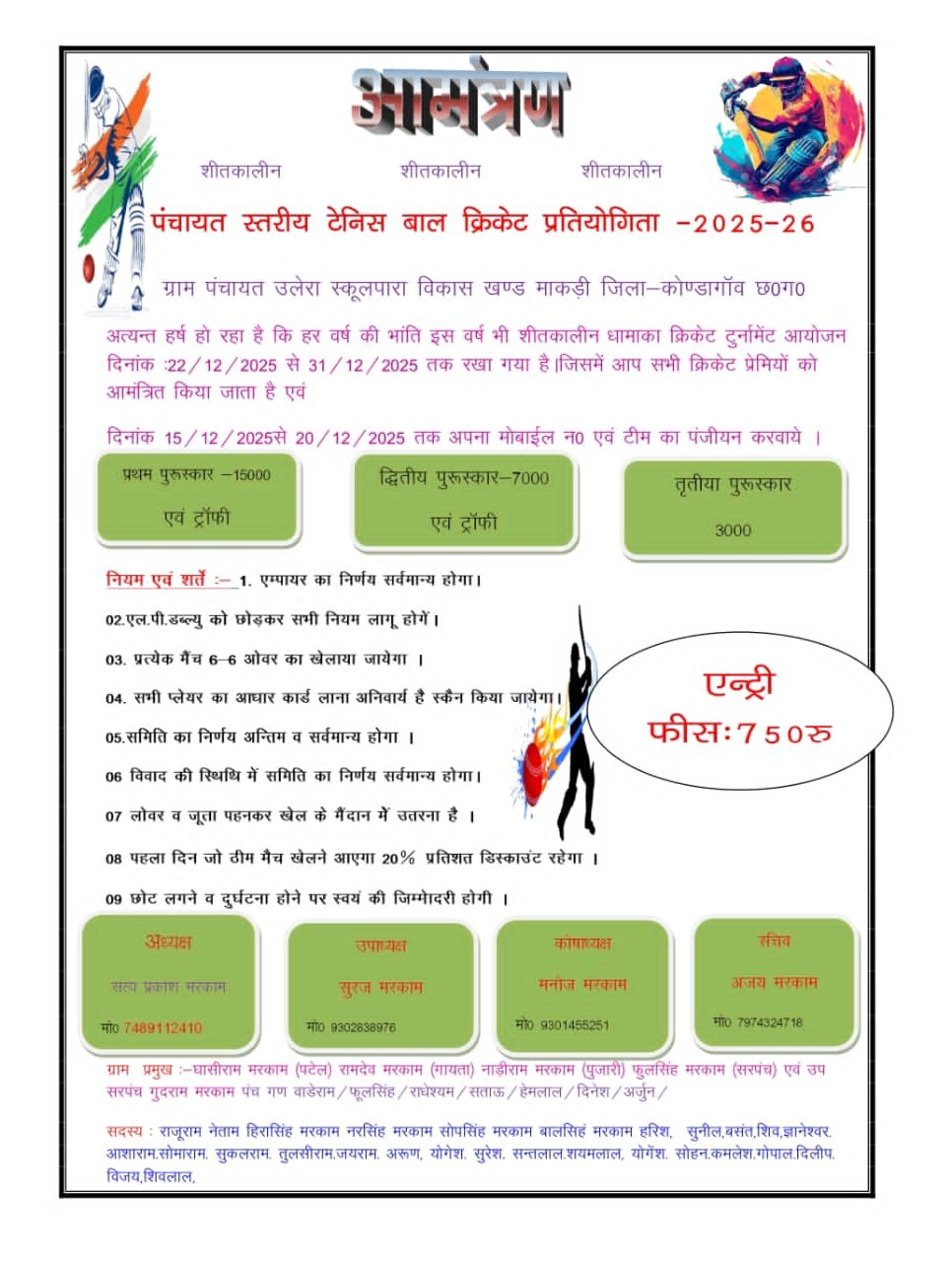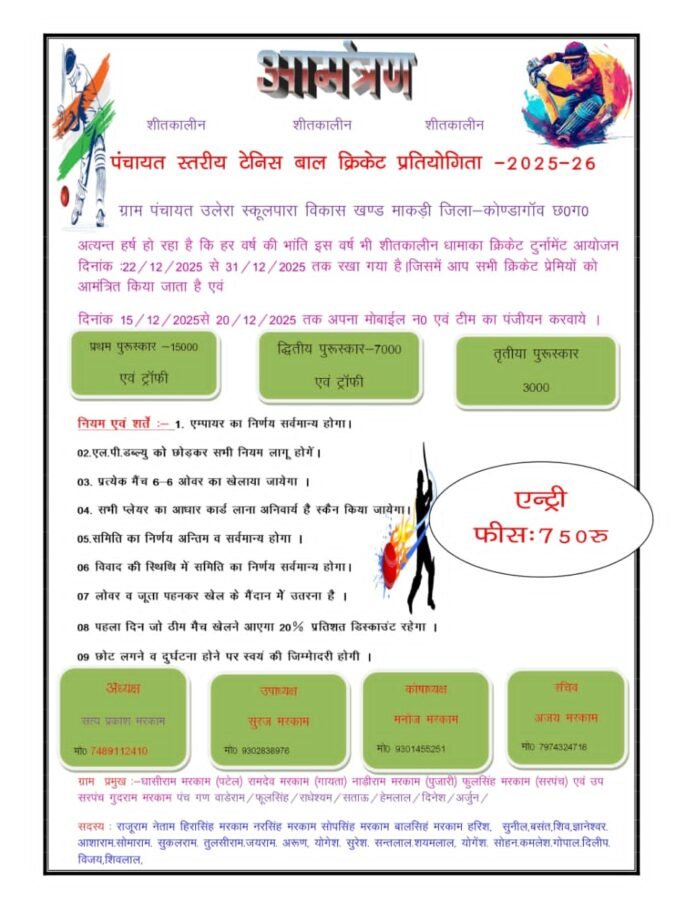 माकड़ी/उलेरा ~ कोंडागांव जिले के विकासखण्ड माकड़ी अंतर्गत ग्राम पंचायत उलेरा स्कूल पारा मैदान में हर वर्ष कीभांति इस वर्ष भी शीतकालीन के शुभ अवसर पर पंचायत स्तरीय टेनिस बाल क्रिकेट प्रतियोगिता का आयोजन 22 दिसम्बर से 31 दिसम्बर तक किया जा रहा है जिसमें क्रिकेट प्रतियोगिता में भाग लेने वाले टीम को एंट्री फीस 750 रूप्रथम पुरस्कार 15000 एवं ट्राफी और द्वितीय पुरस्कार 7000 एवं ट्राफी और तृतीय पुरस्कार 3000 रु रखा गया है जिसमें क्रिकेट समिति के अध्यक्ष सत्यप्रकाश मरकाम मो 7489112410 और उपाध्यक्ष सुरज मरकाम 9302838976 कोषाध्यक्ष मनोज मरकाम 9301455251सचिव अजय मरकाम 7974324718 पर सम्पर्क कर सकते हैं|