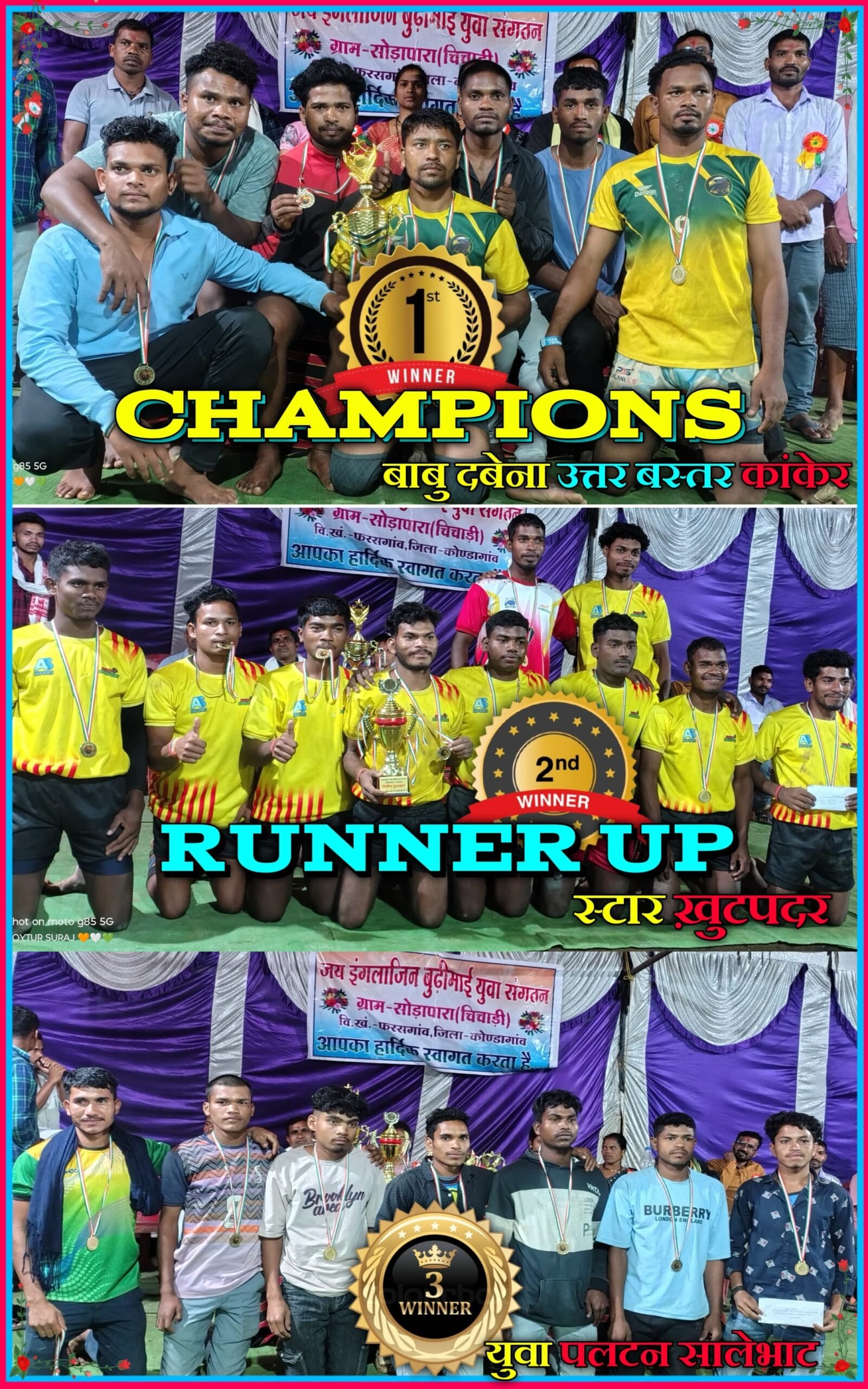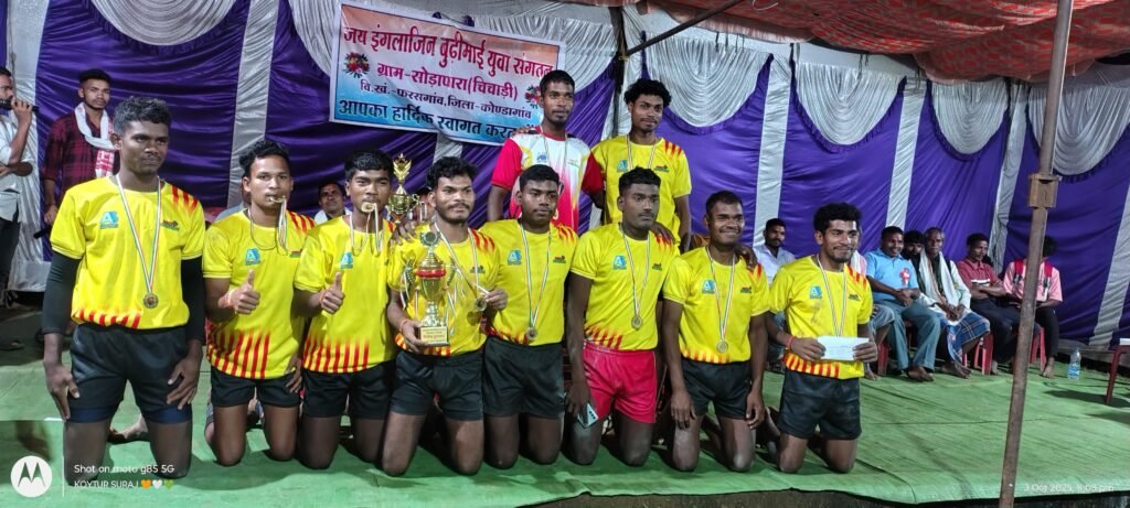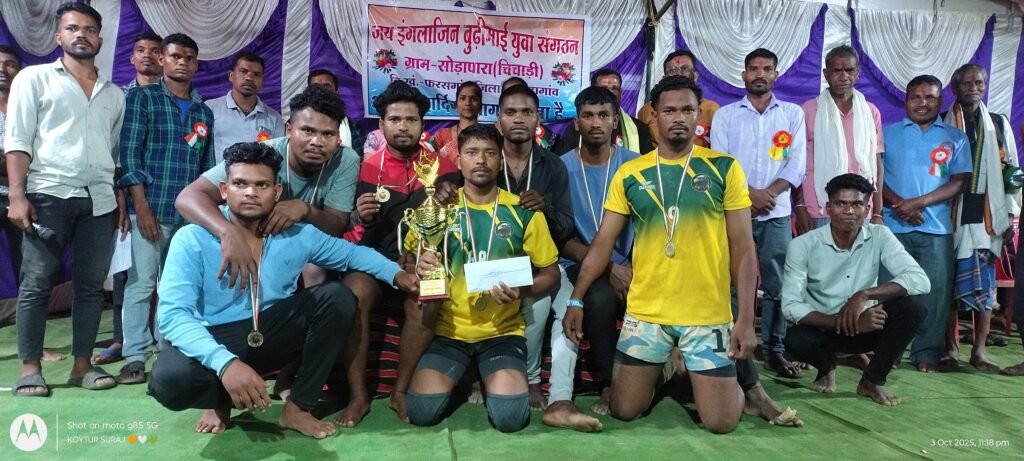 जय इंग्लाजिन बूढ़ी माई युवा – युवती संगठन सोड़ापारा ( चिचाड़ी ) के तत्वधान में एक दिवसीय राज्य स्तरीय डे – नाइट प्रो. कबड्डी प्रतियोगिता 2025 का सीजन 03 ( तीसरा ) सफलता पूर्वक आयोजित किया गया । जिसमें कुल 27 प्रतिभागी टीमों ने हिस्सा लिया। जिसमें सभी टीमों ने अपने – अपने हुनर का प्रदर्शन किया और खेल भावना भावना का परिचय देते हुए अनुशासनता दिखाई । जिसमें बाबू दबेना ( उ. ब. कांकेर ) की टीम ने स्टार ख़ुटपदर को पराजित कर प्रथम स्थान हासिल किया जिसमें बेस्ट रेडर– प्रीतम कुर्रे और बेस्ट डिफेंडर– अनु नेताम रहे। जिसमें ख़ुटपदर की टीम रनर अप रही और युवा पलटन सालेभाट की टीम तृतीय स्थान पर रही।
